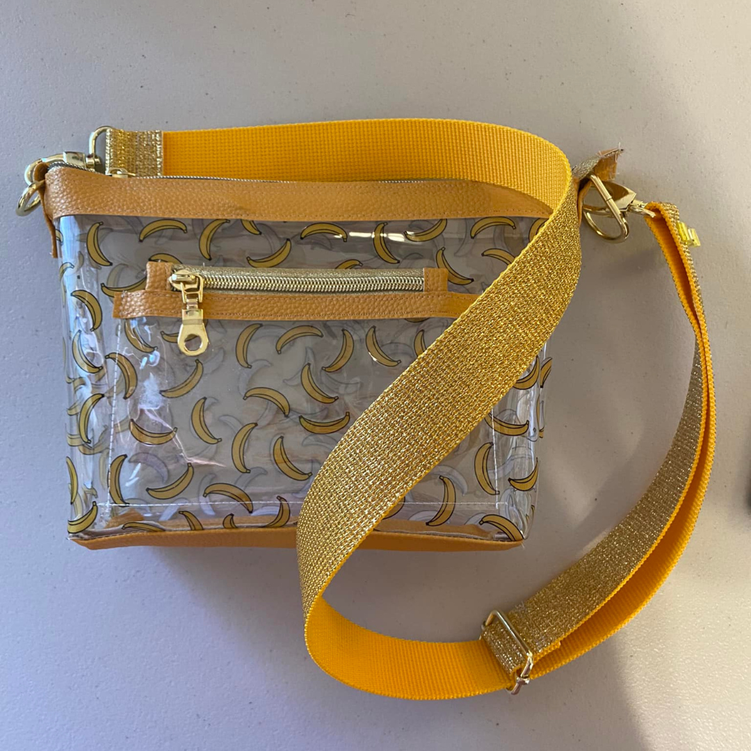 See-through clear vinyl printed with sweet little yellow bananas, featuring an ultra-smooth finish. The vinyl is 12 gauge in thickness, as described below -- it's easy to sew with a Teflon foot and regular home sewing machine. This is a TPU vinyl like most of my products, and this component makes it pliable and sturdy for bag making.